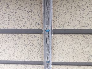 コーキングと呼ばれる、壁材と壁材の間のゴムのつなぎ目が、ひび割れ、破断してしまう現象です。写真では、ブルーのバックアップ剤(下地)が見えてしまっています。