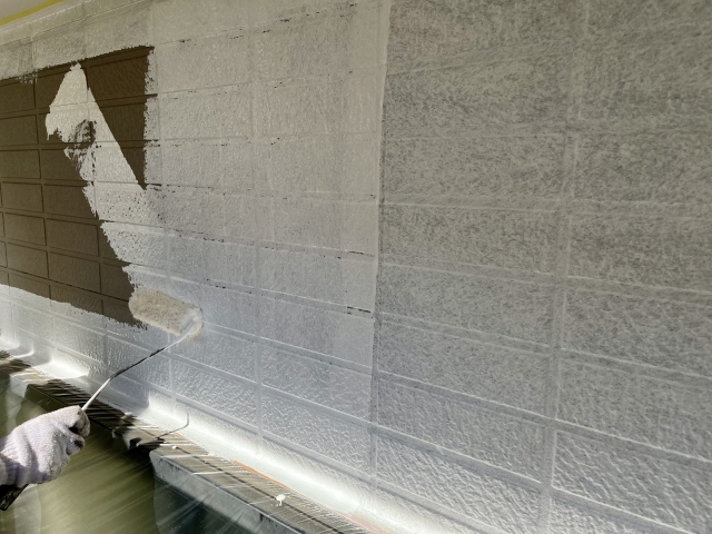 ここからいよいよ塗装です。まずは「下塗り」と呼ばれる接着剤の役割をする塗料を塗ります。上塗り塗料との密着性を高める重要な工程です