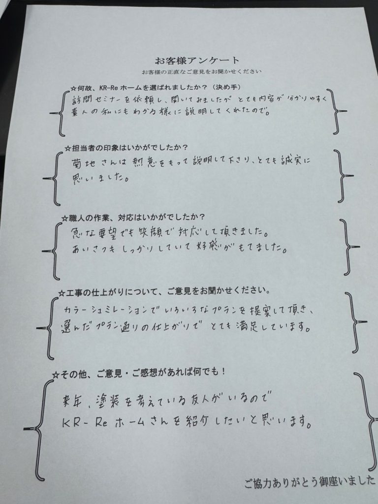カラーシュミレーションでいろいろなプランを提案していただき、選んだプラン通りの仕上がりでとても満足しています。